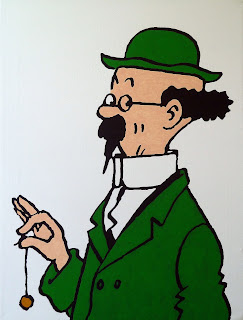 D'après l'illustration de l'album de HERGE Les Aventures deTintin - L'affaire Tournesol, page 54, case 3, et également à partir de l'illustration dans la galerie de portraits dans les pages de garde bleu clair des albums.
